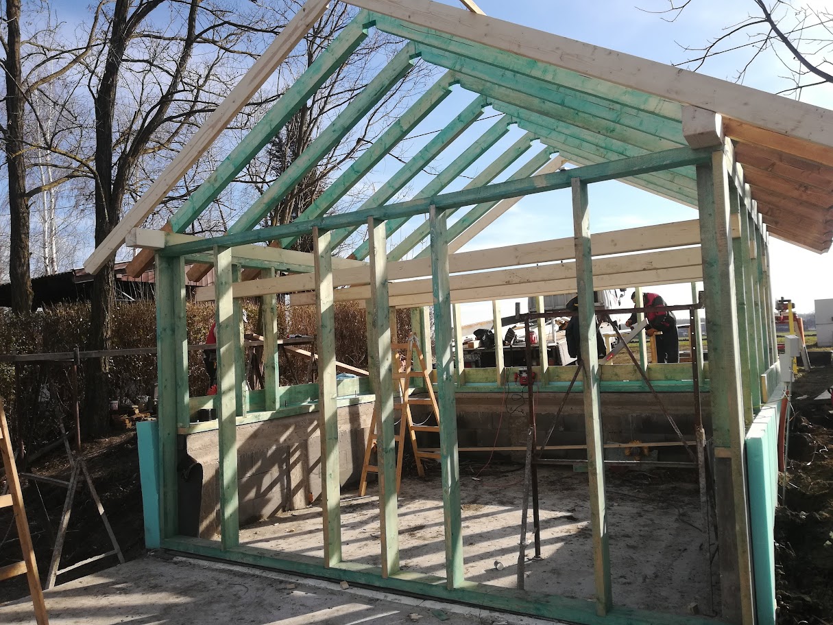 A tetőszerkezet megépítése, vízzáró fedőréteg készítése.
